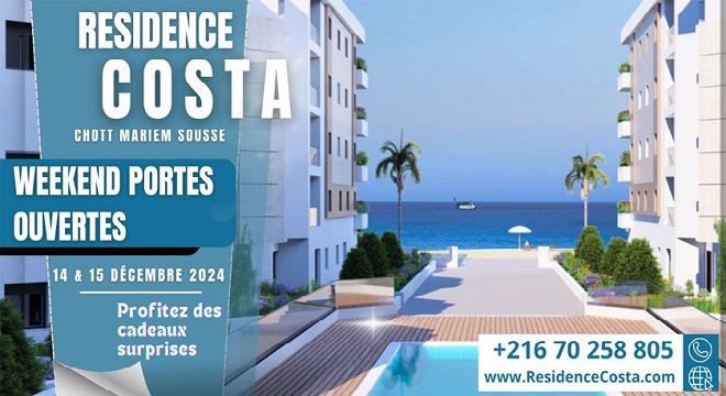 Tunisie-Tribune (résidence Costa) – La Société Kahloun Immobilière a le plaisir de vous convier à son événement : Week-end portes ouvertes de la résidence Costa, située à Chott Mariem, Sousse. Rendez-vous sur place les samedi 14 et dimanche 15 décembre 2024 pour découvrir cet écrin en bord de mer.