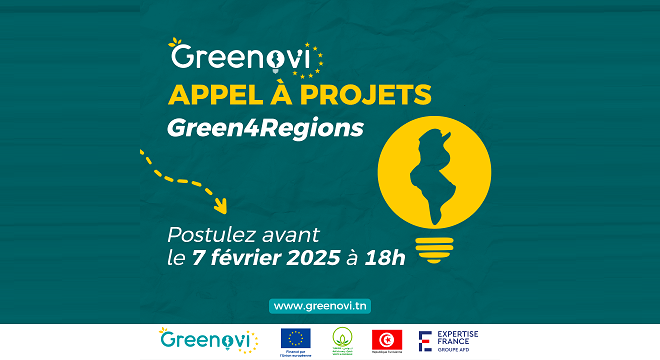 Tunisie-Tribune (Greenov’i) – Greenov’i, projet financé par l’Union Européenne et mis en œuvre par Expertise France en collaboration avec le CITET, le Ministère de l’Environnement et le Ministère de l’Economie et de la Planification, lance son deuxième Appel à Projets GREEN4REGIONS dans le cadre de son appui à l’éco-entrepreneuriat en Tunisie.