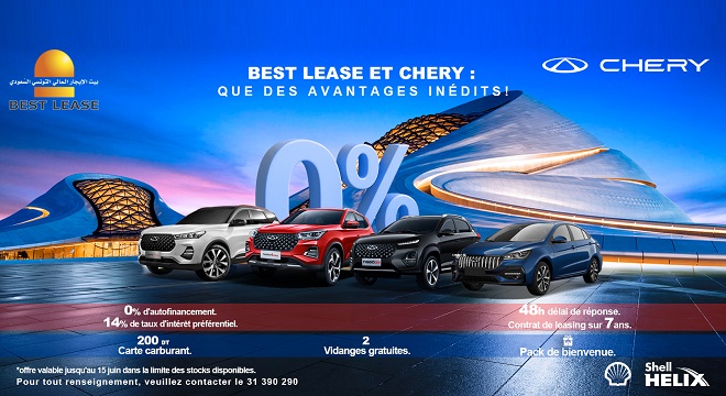 Tunisie-Tribune (BEST LEASE ET CHERY) – La Société Tunisienne d’Automobiles (STA), concessionnaire officiel CHERY en Tunisie, s’associe à BEST LEASE pour vous ouvrir les portes de la liberté au volant avec une offre à couper le souffle, valable du 15 avril au 15 juin !