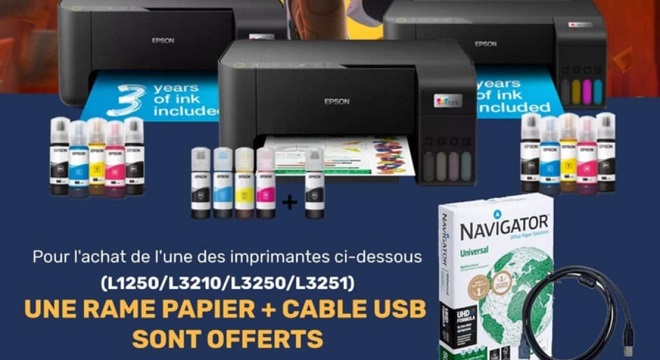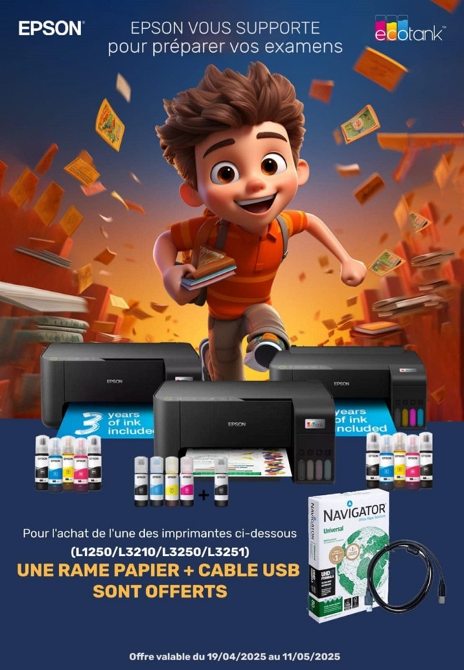 Du 19 avril au 11 mai 2025, pour tout achat d’une imprimante Epson EcoTank L1250, L3210, L3250 ou L3251 dans les points de vente agréés, les clients recevront une rame de papier ainsi qu’un câble USB offerts. Une initiative qui vise à fournir une solution d’impression complète, accessible et durable, idéale pour accompagner les élèves dans leurs révisions et la préparation de leurs examens.