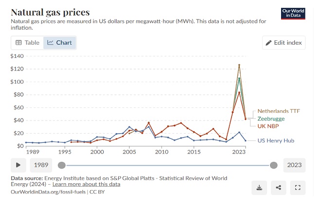 D’ailleurs, les calculs économiques montrent, qu’en 2023-2024, le GNL importé par l’Europe en provenance des USA et regazéifié dans les ports pour être injecté dans les réseaux de gaz naturel coûte moins cher que le gaz naturel importé par gazoduc des pays voisins. Cette situation s’explique en partie par la rareté du gaz naturel après la guerre d’Ukraine mais aussi par l’abondance du gaz américain, où l’extraction schisteuse ne pose pas de problèmes, qui est liquéfié et exporté faisant des USA le plus grand exportateur mondial de GNL.