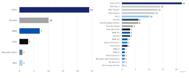 Volvo maintient son titre de « Voiture électrique la plus vendue en Tunisie » obtenue l’année dernière en continuant d’occuper la première place en 2025 arrêté à fin avril en se référant aux données statistiques d’immatriculation officielles. Le fameux EX30 continue sa domination puisqu’il écrase son propre record de vente enregistré au mois de décembre 2024 (12unités) avec 13 unités de voitures électriques immatriculées au mois d’avril 2025.