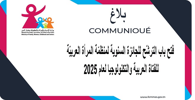Le Ministère de la Famille, de la Femme, de l’Enfance et des Personnes Âgées porte à la connaissance du public que l’Organisation de la Femme Arabe ouvre les candidatures pour la nouvelle édition de son Prix annuel, placée sous le thème :