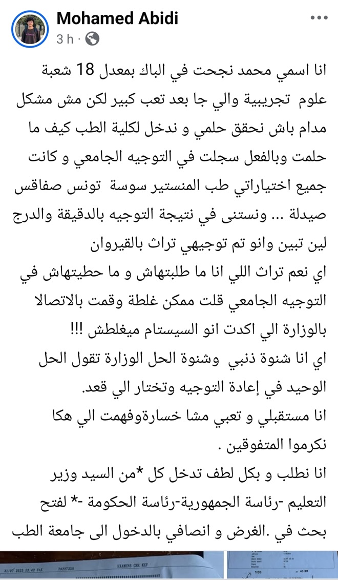 Sur sa page Facebook ce vendredi 1er août 2025, le jeune homme affirme avoir sélectionné uniquement des facultés de médecine et de pharmacie dans ses vœux d’orientation (Monastir, Sousse, Tunis, Sfax). Mais à la publication des résultats, il découvre avec stupeur qu’il a été affecté à une filière non demandée.