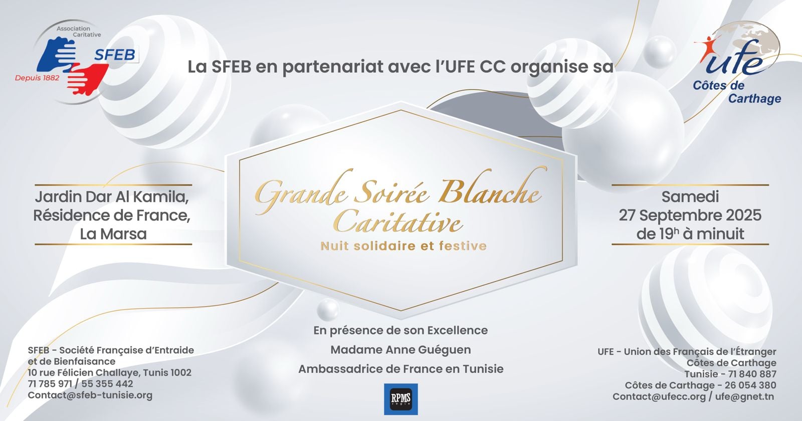 Tunisie-Tribune (SFEB) – La Société Française d’Entraide et de Bienfaisance de Tunisie (SFEB), en partenariat avec l’UFE Côtes de Carthage, a l’honneur d’annoncer la tenue de sa traditionnelle Soirée Blanche Caritative le samedi 27 septembre 2025 à 19h00, dans les Jardins de la Résidence de France – Dar El Kamila, La Marsa.