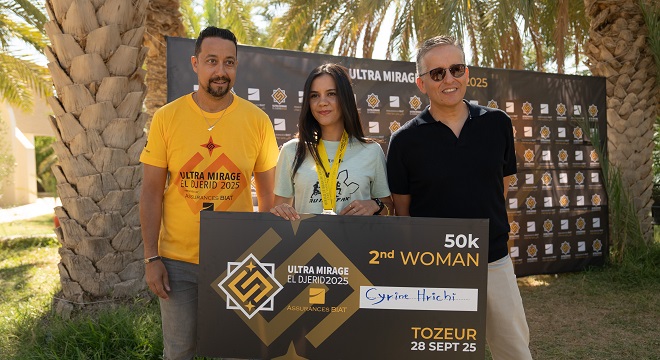 Quant à la nouvelle épreuve Assurance BIAT Trail 25 km, Mourad Zamouri a décroché la première place en 1 h 59 min 33 s, tandis que Josephine Durin s’est distinguée chez les femmes avec un temps de 3 h 11 min 31 s. Ces performances de haut niveau ont consolidé la renommée internationale de l’Ultra Mirage El Djérid, confirmant son statut d’événement sportif emblématique du désert tunisien et rendez-vous incontournable de l’ultra-trail mondial. Les taux de finissants, particulièrement élevés, reflètent la rigueur et la détermination, détermination des coureurs : 97 % sur le 25 km, 92 % sur le 50 km et 86 % sur le 100 km.