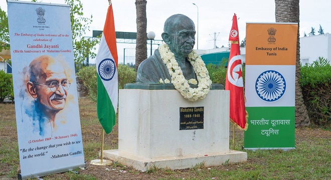 Tunisie-Tribune (Mahatma Gandhi) – L’ambassade de l’Inde à Tunis a célébré l’anniversaire de la naissance du Mahatma Gandhi le jeudi 2 octobre 2025 à la Faculté des Lettres, des Arts et des Humanités de la Manouba. La fête Gandhi Jayanti, célébrée chaque année le 2 octobre, commémore la vie et les idéaux du Mahatma Gandhi, apôtre de la paix et de la non-violence, et père de la nation indienne. Un buste du Mahatma Gandhi a été inauguré à cette faculté en octobre 2025.
