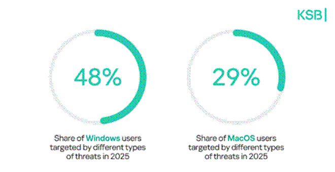 Windows reste la cible principale des cyberattaques. 48% des utilisateurs sous Windows ont été ciblés par différents types de menaces tout au long de 2025. Pour les utilisateurs Mac, ce chiffre s’élève à 29%.