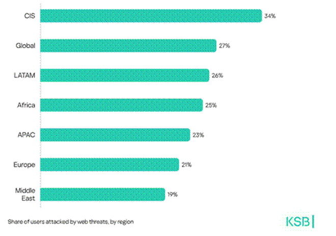 Au niveau mondial, 27 % des utilisateurs ont été touchés par des menaces Web des attaques visant les internautes au cours de leur navigation. Même s’ils ne se limitent pas uniquement à l’activité en ligne, ces malwares nécessitent toutefois à un moment ou un autre de recourir à Internet pour causer des préjudices.