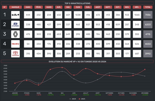 C’est la particularité du marché tunisien : une marque de véhicules utilitaires se hisse dans le Top 5 global. Isuzu a écoulé 4 033 véhicules.