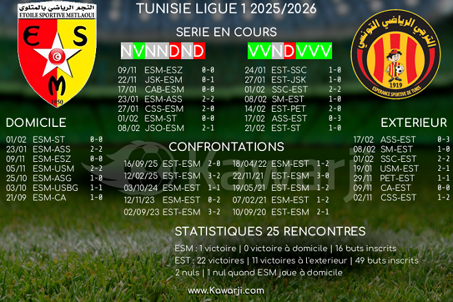 Tunisie-Tribune (Ligue 1) – Avant la rencontre prévue ce mercredi pour le compte de la 21ème journée de Ligue 1 tunisienne 2025-2026, voici l’historique de cette confrontation en championnat :