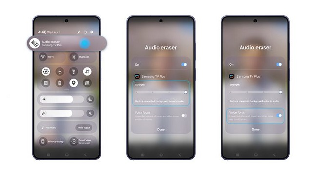 ▲ Accédez à la Gomme Audio via le panneau des Paramètres Rapides, ajustez l’intensité et activez le mode Voice Focus sur la série Galaxy S26.