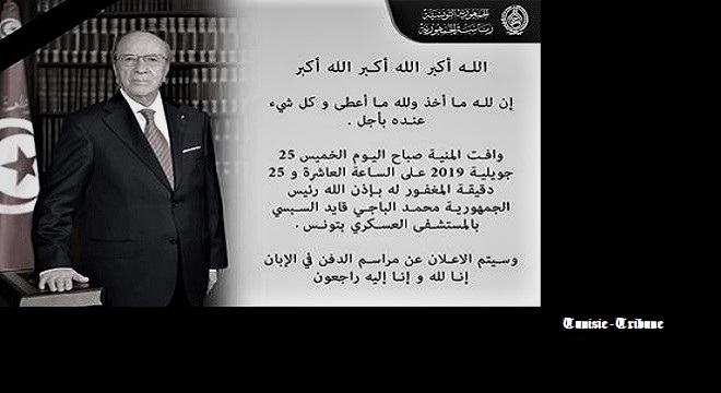 Tunisie-Tribune (Décès de Beji Caied Essebsi) - Le président de la République Beji Caied Essebsi est décédé ce jeudi 25 juillet 2019 à l’hôpital militaire